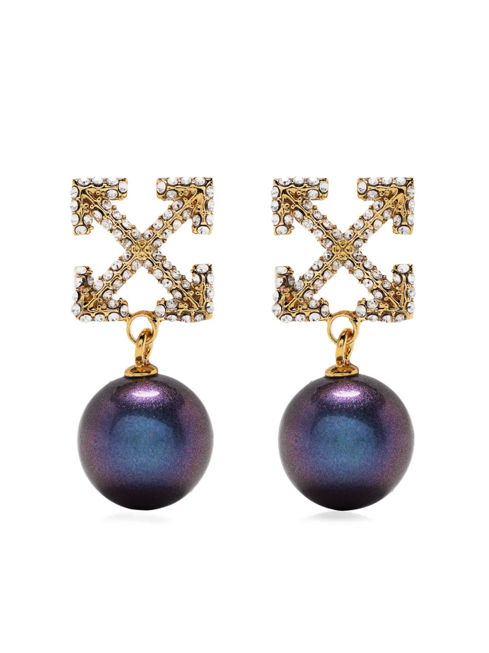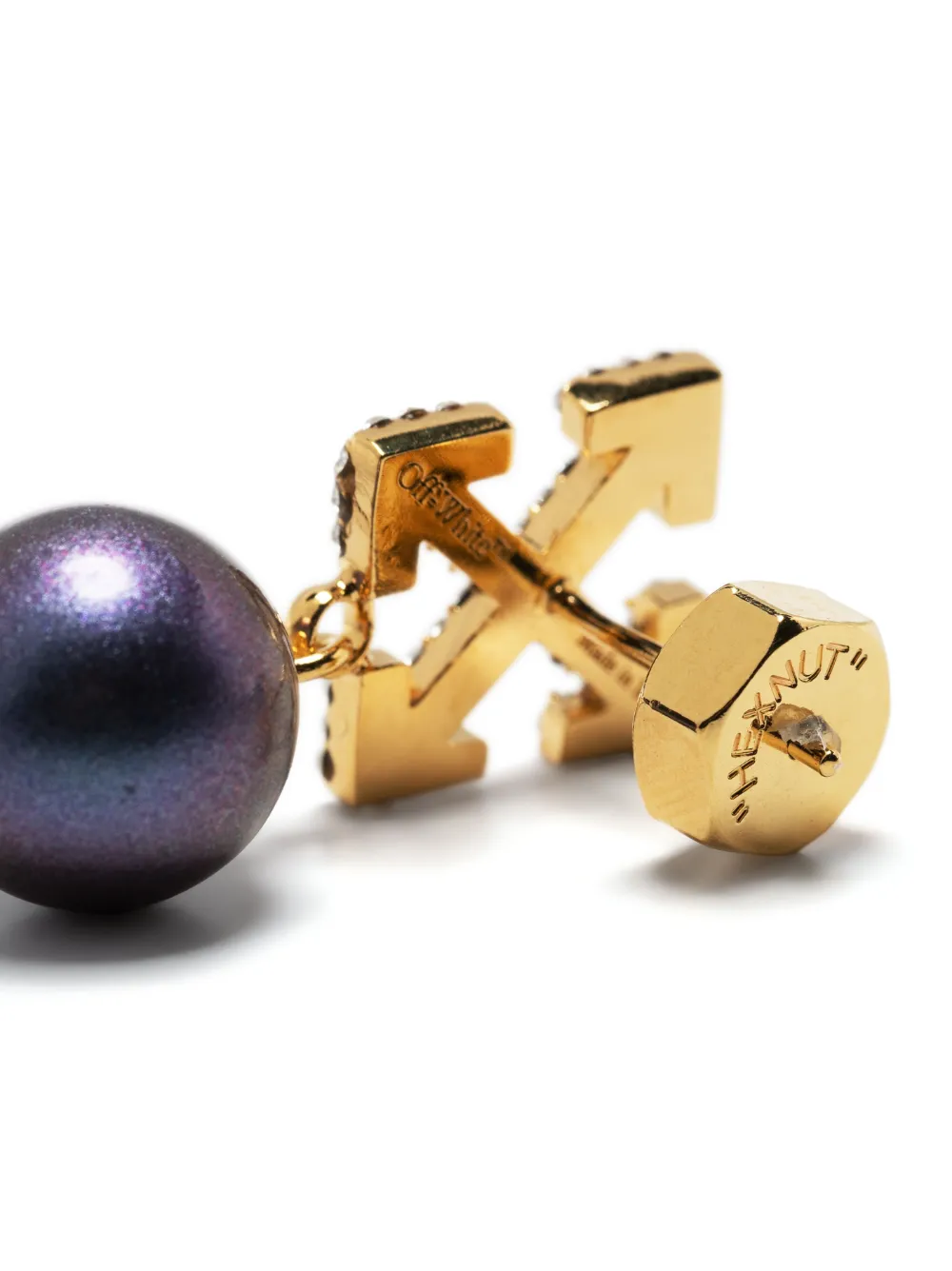 Adorned with a crystal-encrusted arrow logo at the centre, this gold-tone earring embodies Off-White’s directional design vision. A hanging pearl charm elevates the piece, nodding to the label’s love of unexpected detailing.