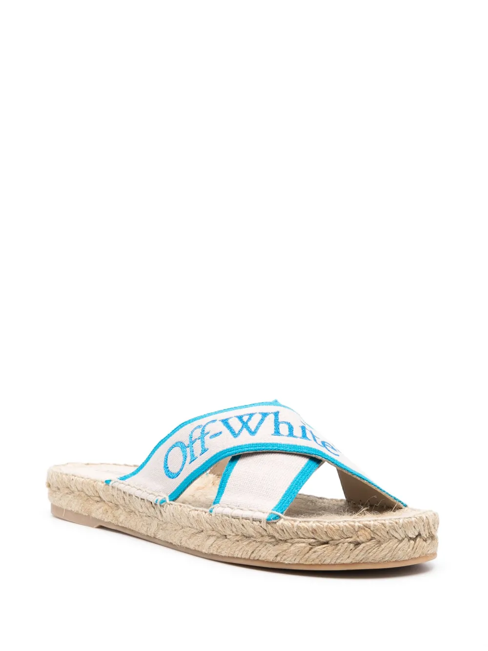 Bookish Criss-Cross espadrille from OFF-WHITE featuring blue, open toe, crossover strap at the toe, embroidered logo to the front, branded insole, braided raffia sole and slip-on style.