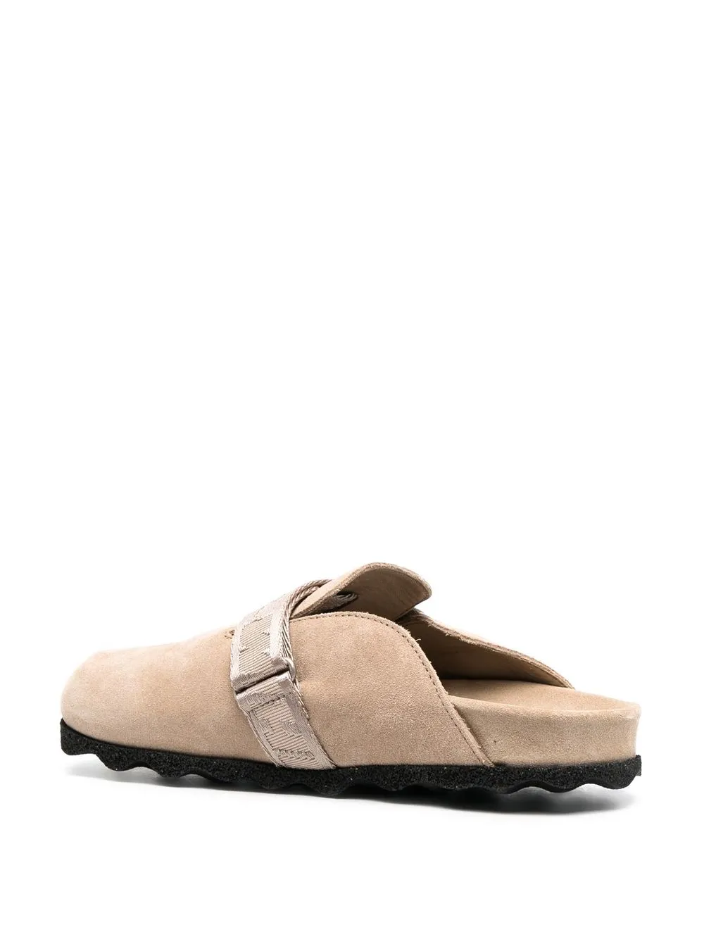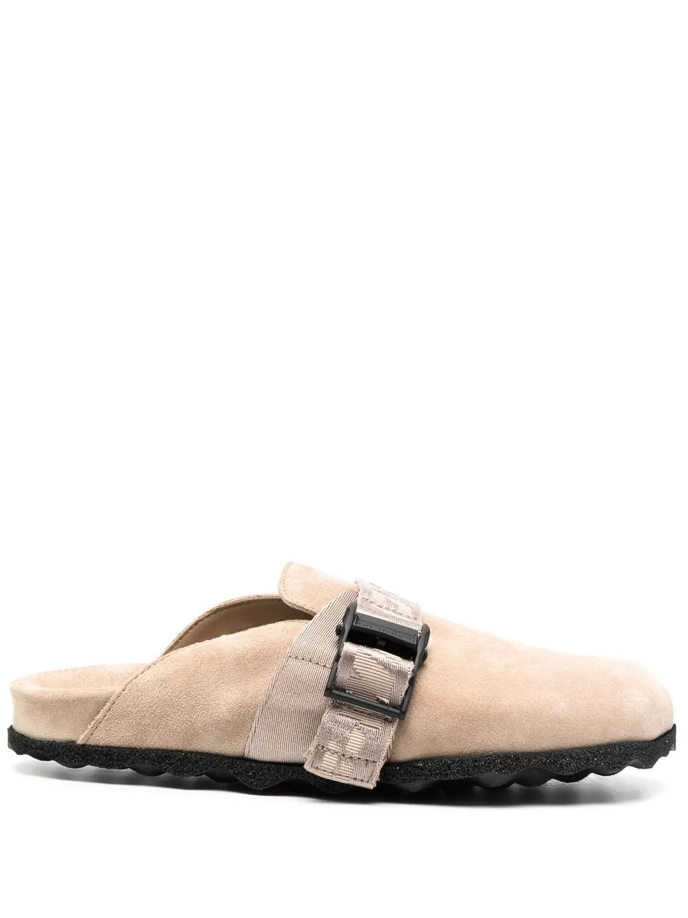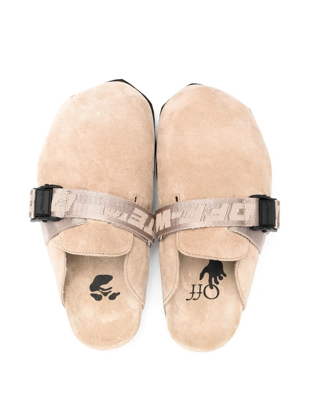 buckled round-toe mules from OFF-WHITE featuring sand beige, leather, decorative buckle detail, slip-on style, round toe, moulded footbed and flat rubber sole.