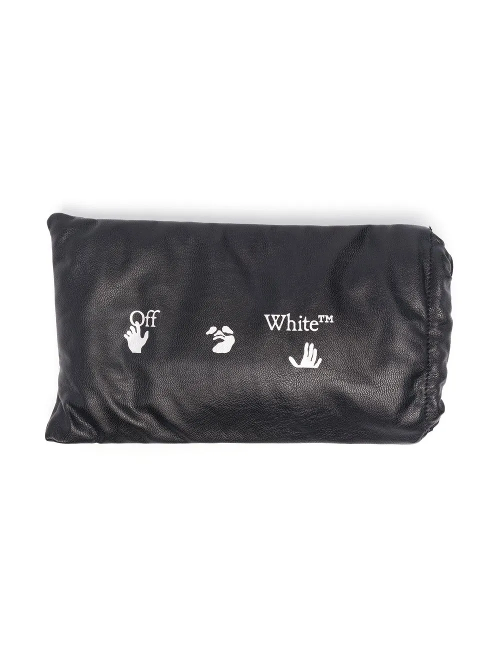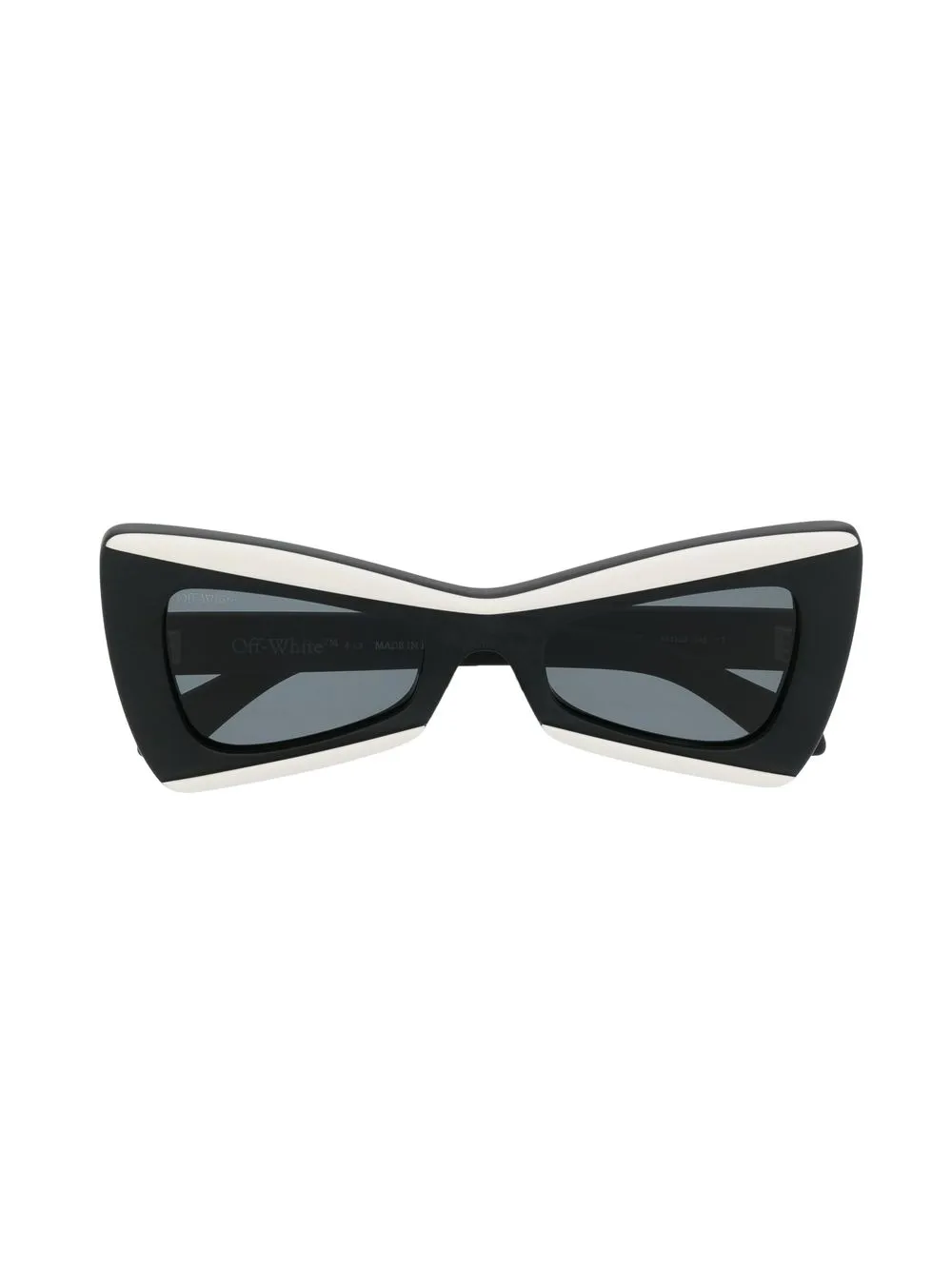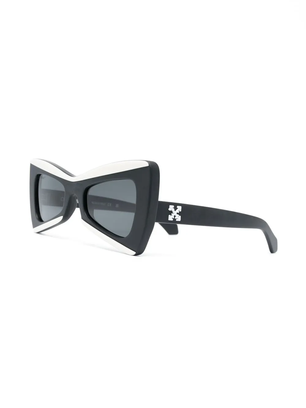 cat-eye tinted sunglasses from OFF-WHITE featuring black/white, acetate, grey tinted lenses, embossed logo to the side, straight arms, curved tips and cat-eye frame. These glasses come with a protective case..