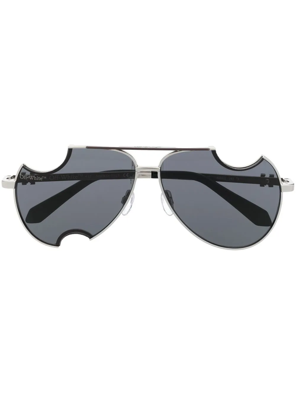 Dallas tinted sunglasses from OFF-WHITE featuring silver-tone, pilot frame, grey tinted lenses, cut-out detailing, tonal logo plaque, double bridge, nose pads, straight arms and curved tips. These glasses come with a protective case..