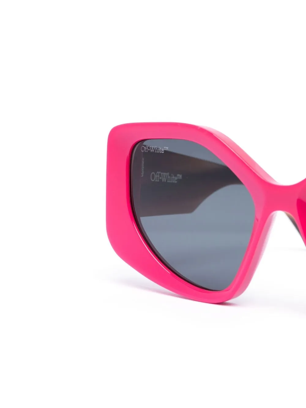 Off-White channels its ethos of playful functionality in these fuchsia pink Denver sunglasses. Characterised by a bold angular frame, they’re stamped at the arm with the brand’s logo in the ubiquitous Helvetica typeface.