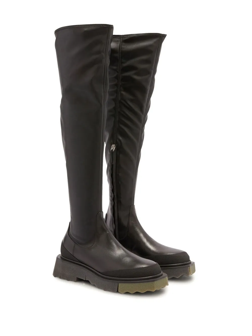 knee-length leather boots from OFF-WHITE featuring black, round toe, slip-on style, knee-length and flat rubber sole.