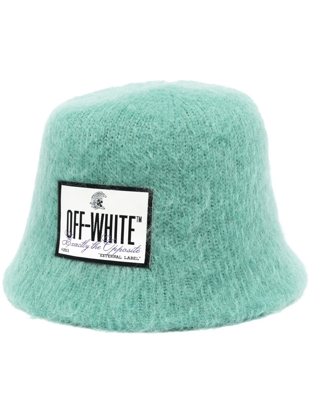Off-White plays with texture in this mohair-blend bucket hat. Punctuated by a monochromatic logo patch to the front, the textured aqua-green mohair construction provides a striking, soft backdrop.