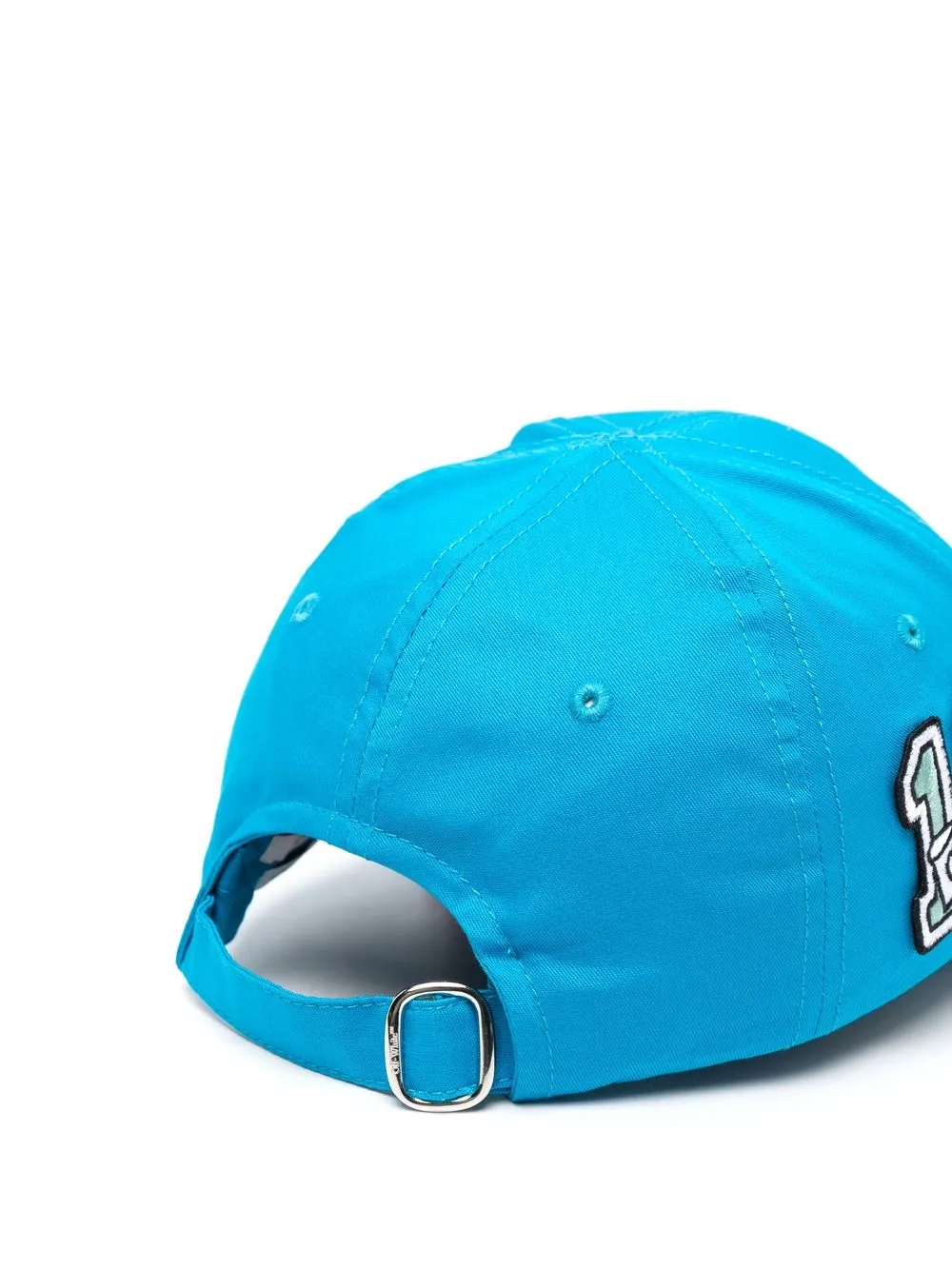 logo-patch six-panel cap from OFF-WHITE featuring aqua blue, cotton, six-panel construction, logo patch to the front, curved peak, eyelet detailing and adjustable strap to the rear.