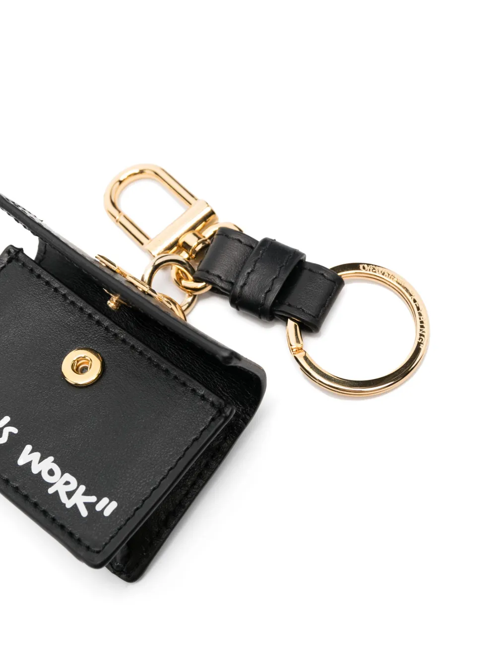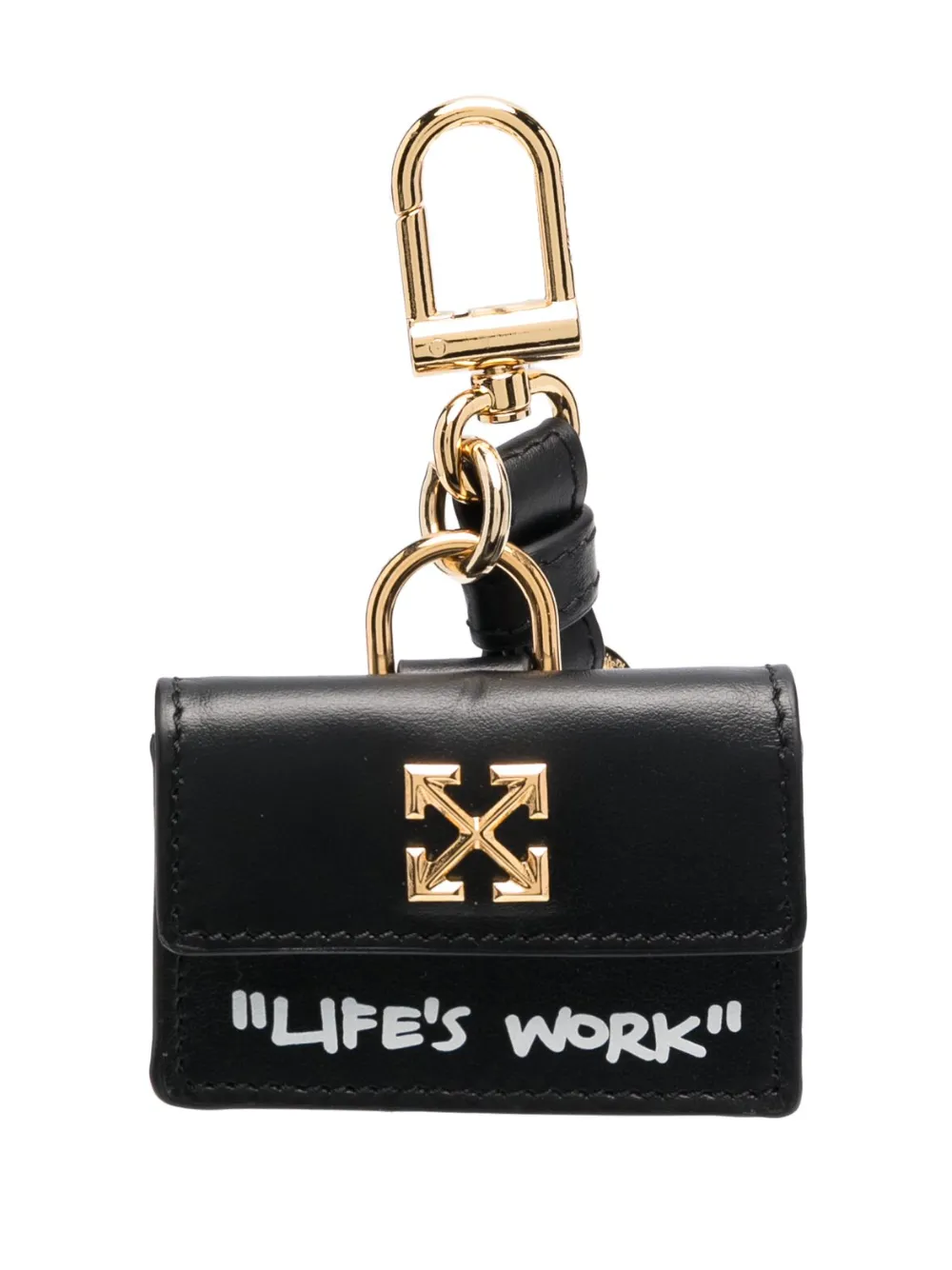 logo-plaque detail keyring from OFF-WHITE featuring foldover top with press-stud fastening, lobster claw fastening, black, leather, gold-tone logo plaque and Life’s Work print.