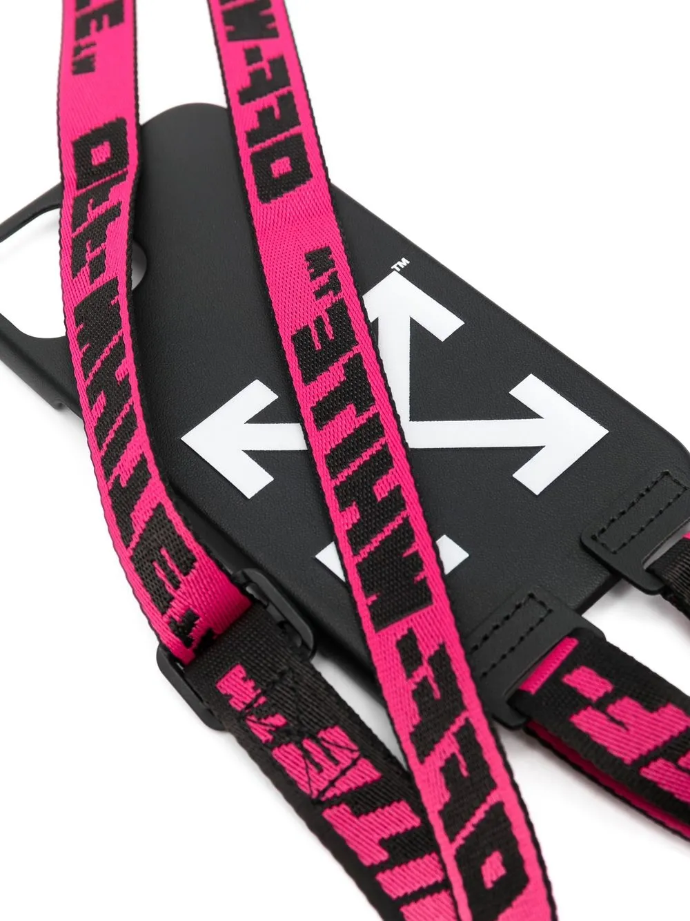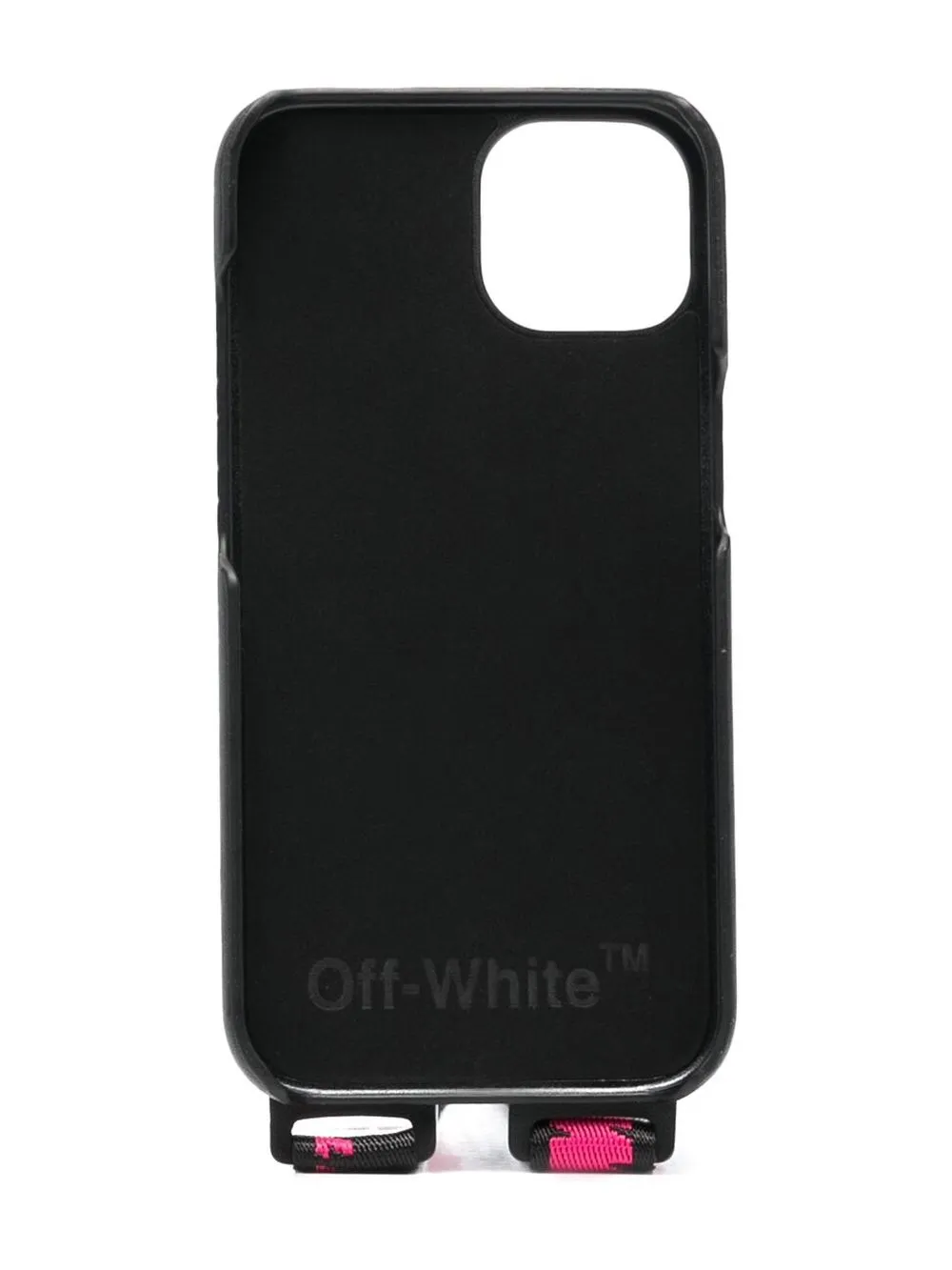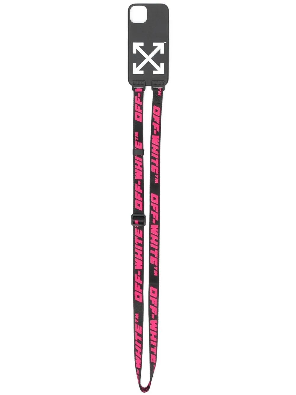 logo-print iPhone 13 case from OFF-WHITE featuring black/white, pink, signature Arrows motif, signature Industrial strap, adjustable neck strap and iPhone 13 compatible.