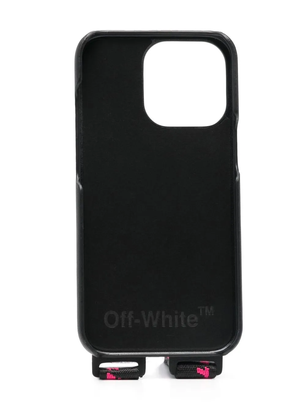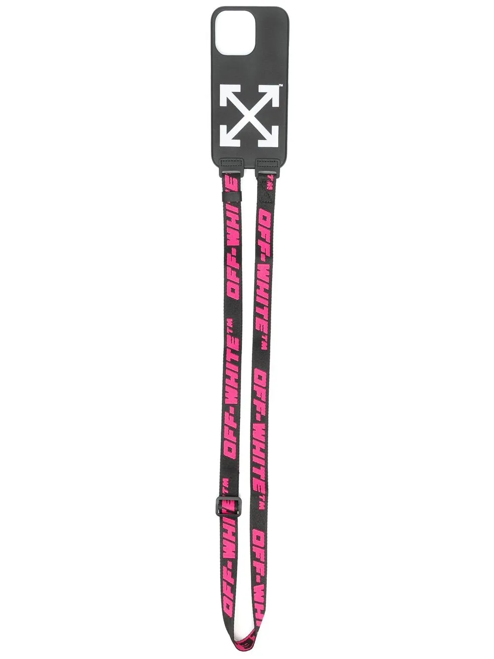 logo-print iPhone 13 Pro case from OFF-WHITE featuring black/white, pink, signature Arrows motif, signature Industrial strap, adjustable neck strap and iPhone 13 Pro compatible.