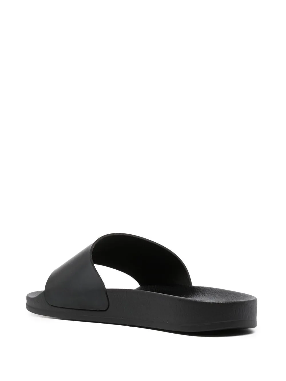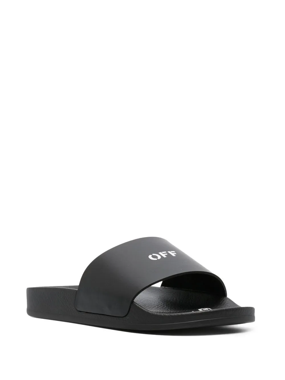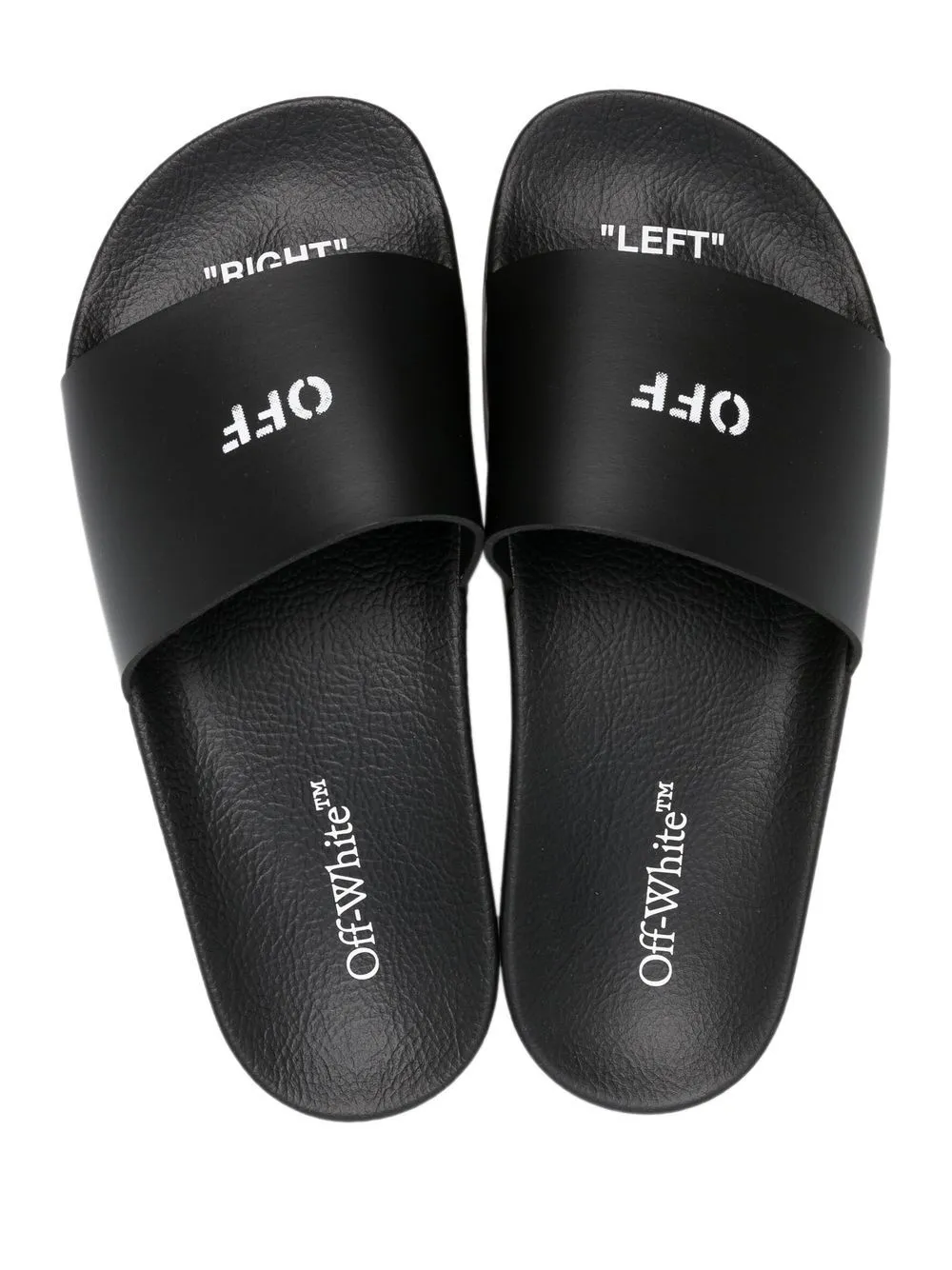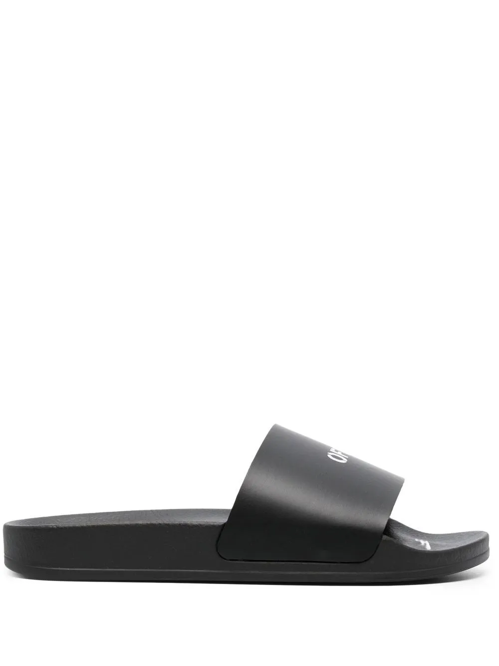 logo-print open toe slides from OFF-WHITE featuring logo print to the front, slip-on style, open toe, branded insole, flat rubber sole and black/white.
