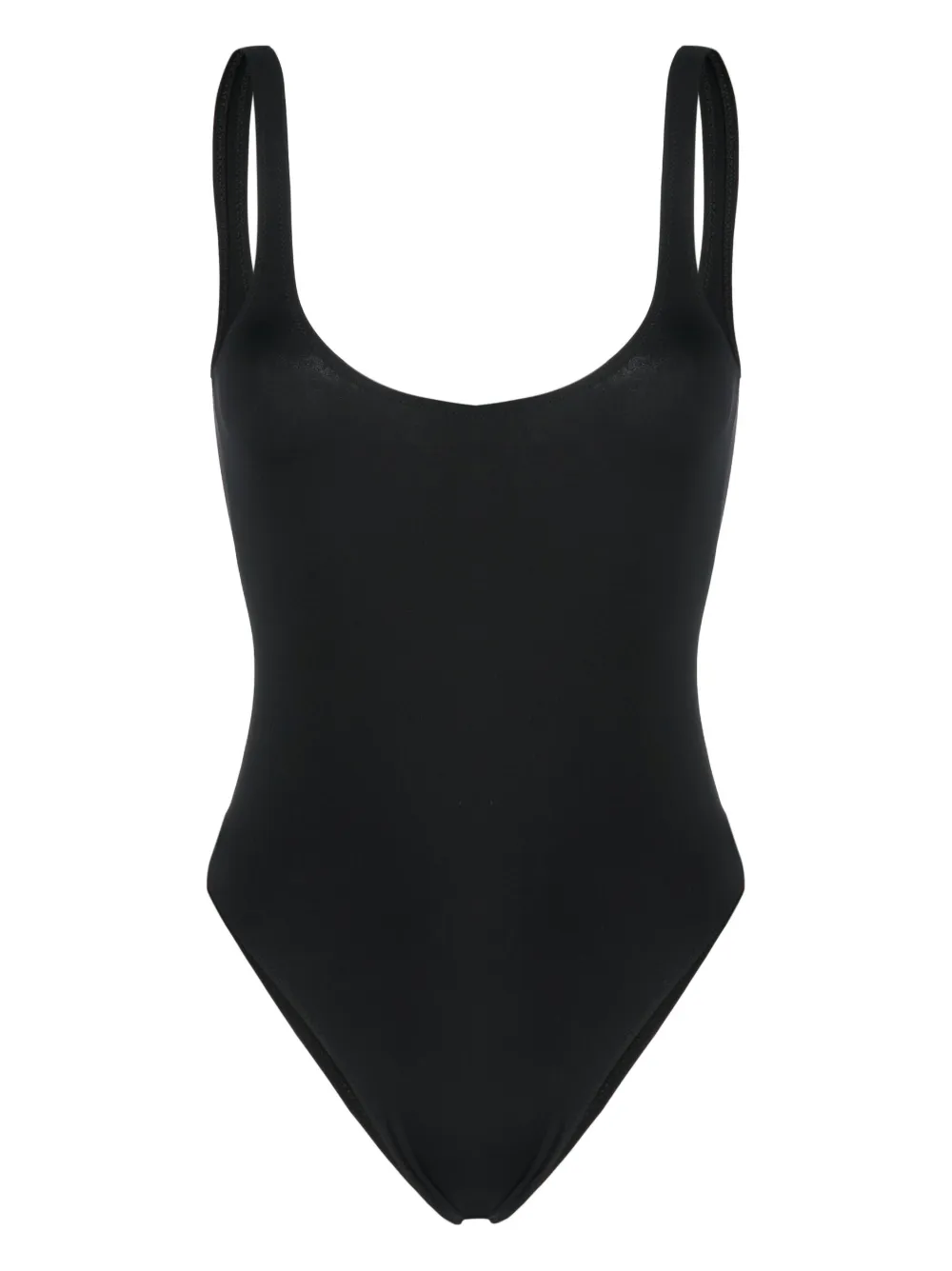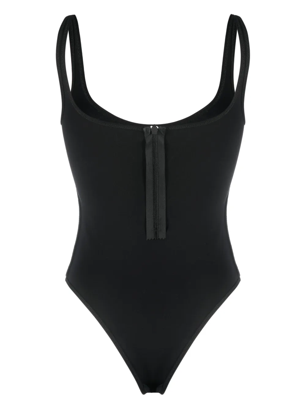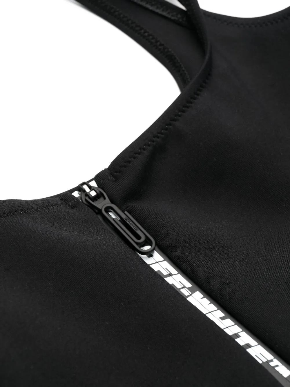 logo-print zip-up swimsuit from OFF-WHITE featuring black, stretch-design, signature paperclip detail, logo print to the rear, scoop neck, scoop back, wide shoulder straps and rear zip fastening. Be mindful to try on swimwear over your own garments..
