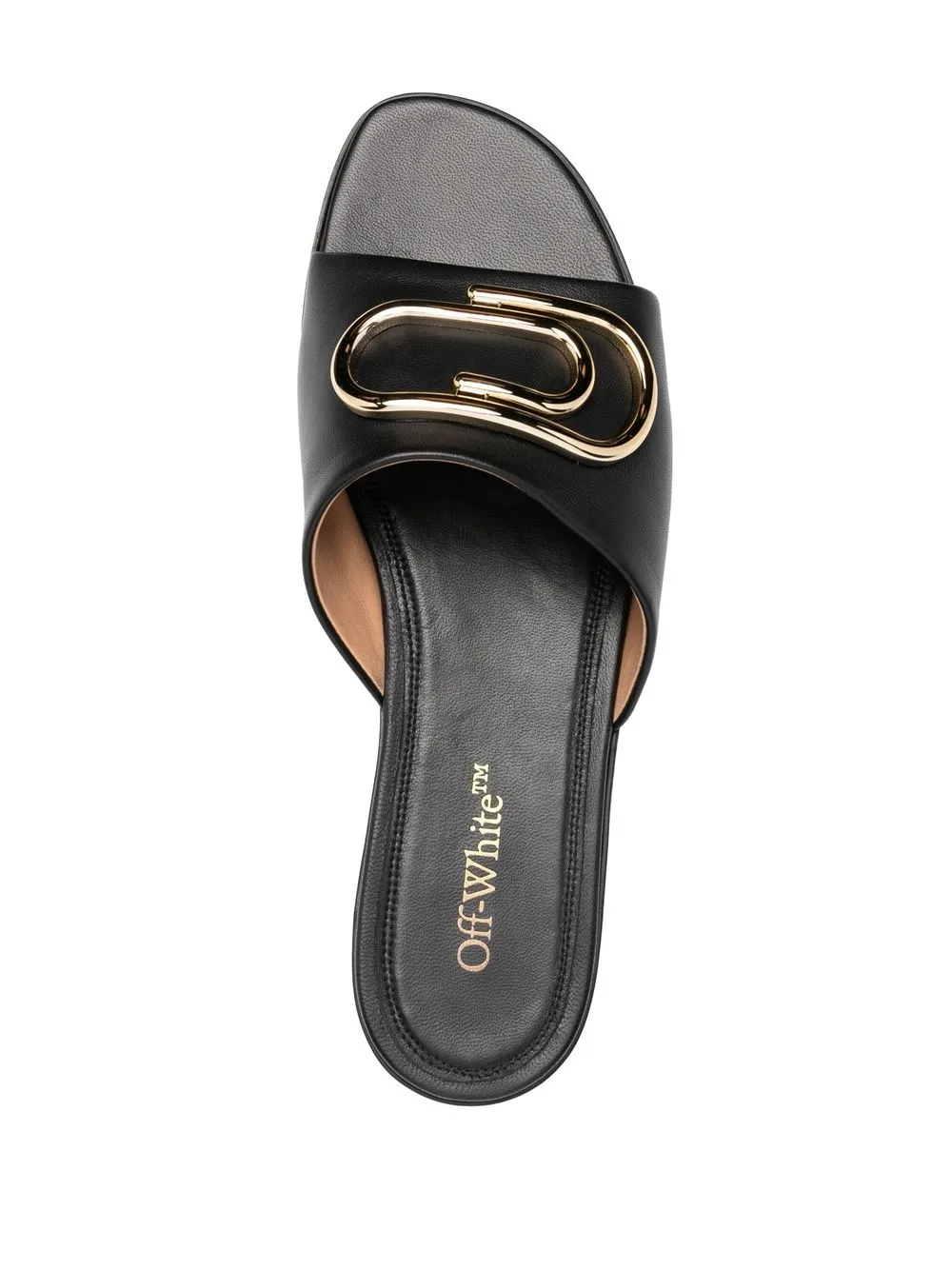 Off-White’s stationary influences were presented in SS19 when the brand’s Binder Clip bags had their debut. For SS23, the house revisits the theme with a gold-tone paperclip in the form of a plaque atop these leather sandals.