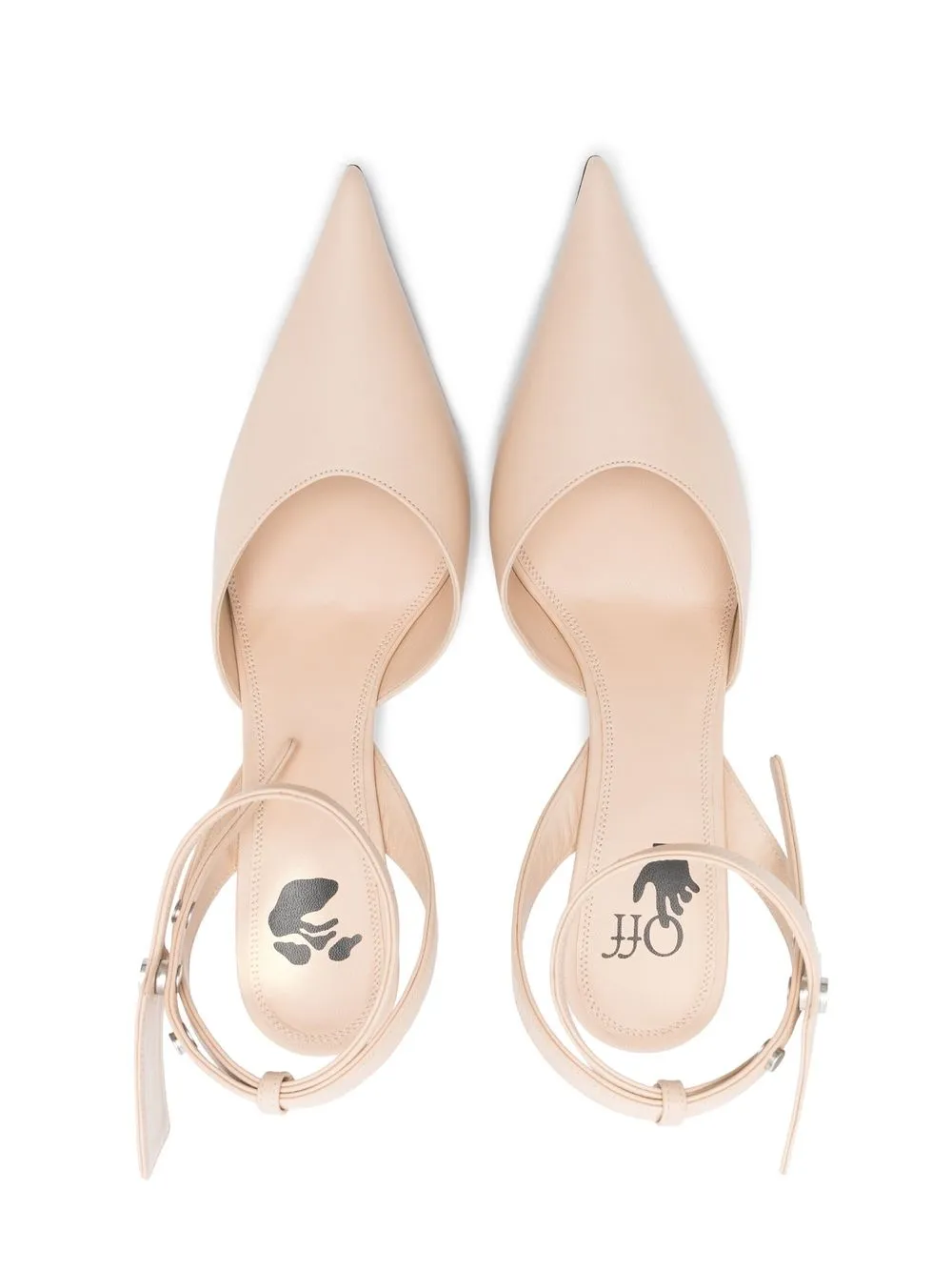 pointed-toe heeled pumps from OFF-WHITE featuring almond beige, leather, pointed toe, logo tag, ankle strap, press-stud fastening, silver-tone hardware and high stiletto heel.