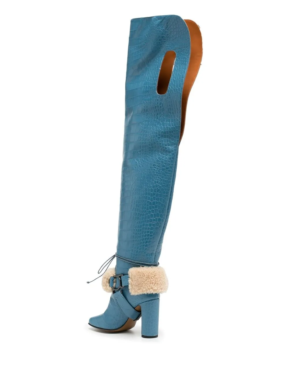 shearling ankle strap boots from OFF-WHITE featuring blue, calf leather, knee-high, slip-on style, cut-out detailing, lace-up detailing, faux-shearling trim, square toe and block heel.