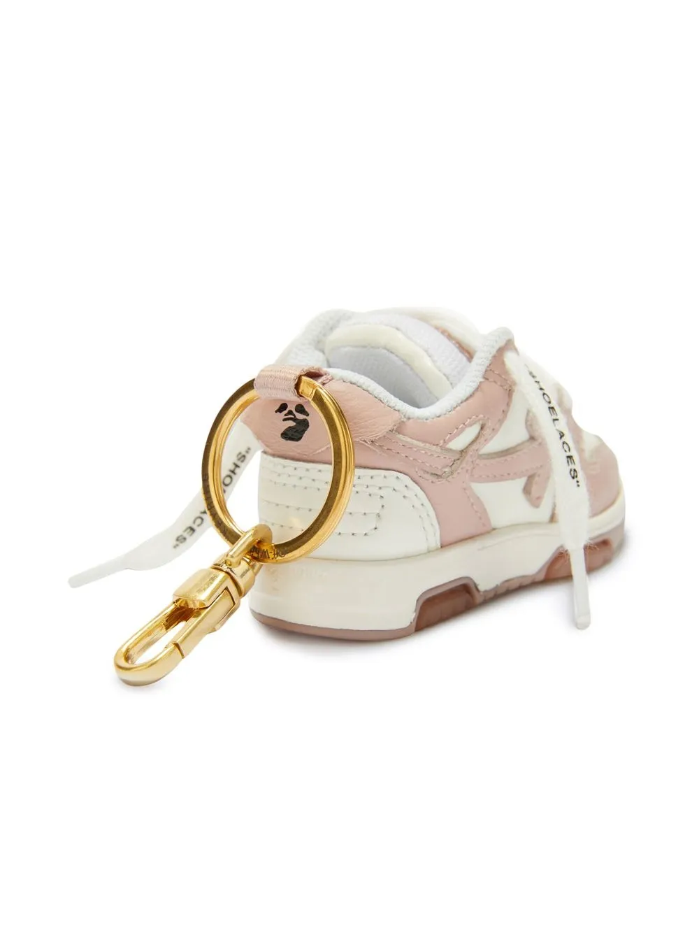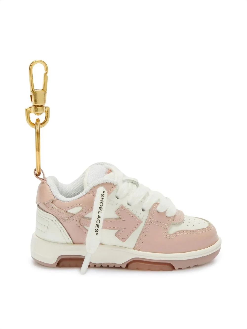 sneaker-motif branded keychain from OFF-WHITE featuring white, light pink, leather, gold-tone hardware, panelled design and lobster claw fastening.