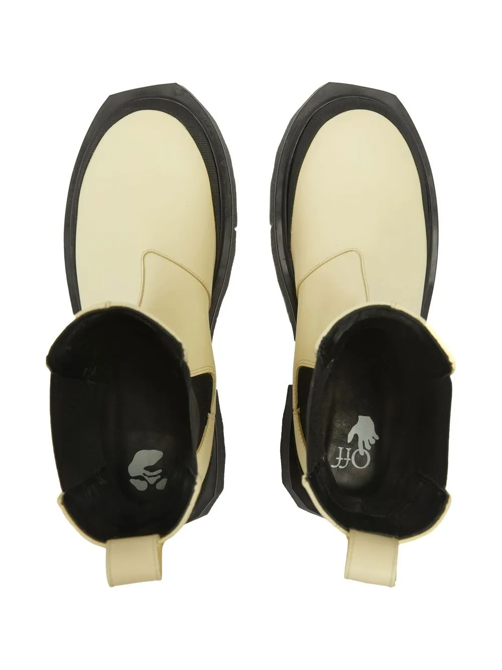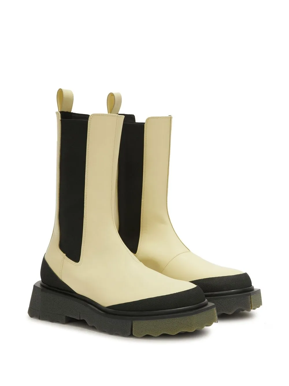 sponge-effect sole Chelsea boots from OFF-WHITE featuring cream white, military green, black, leather, elasticated side panels, round toe, slip-on style, branded insole, pull-tab at the heel and signature sponge-effect sole.