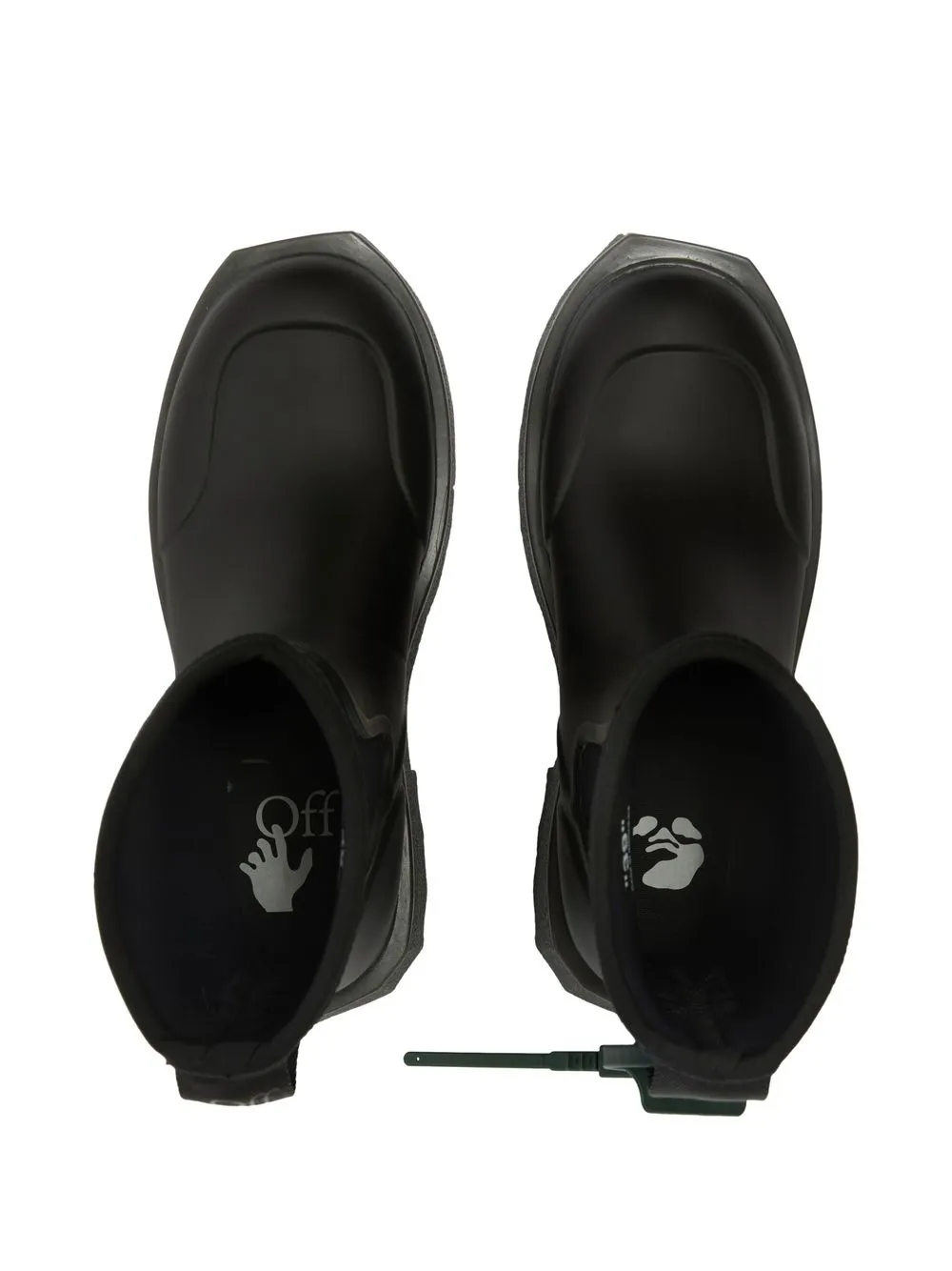 Sponge logo-print rain boots from OFF-WHITE featuring black/white, logo print to the side, round toe, chunky rubber sole and slip-on style.