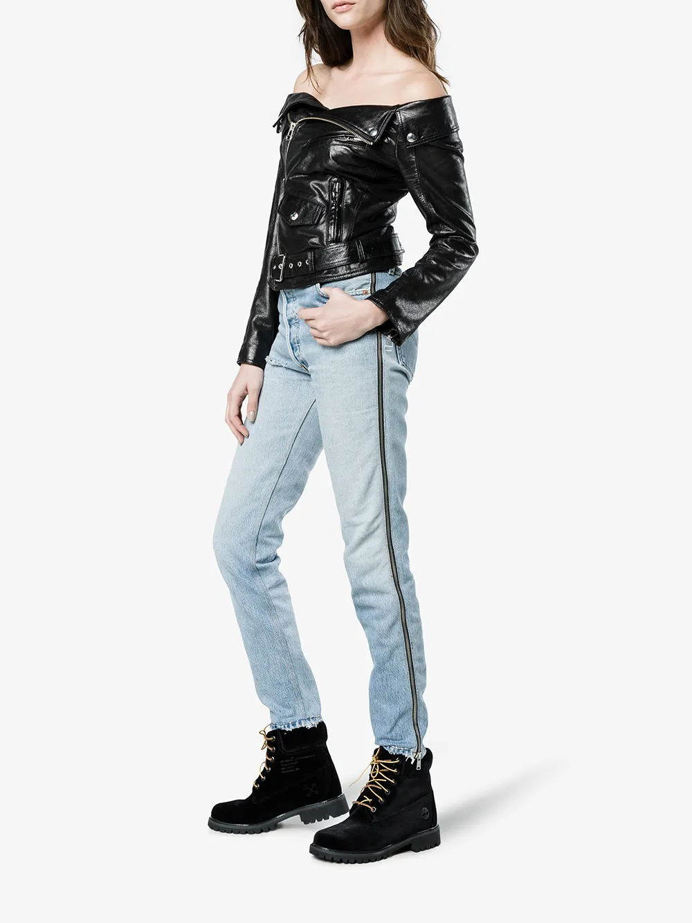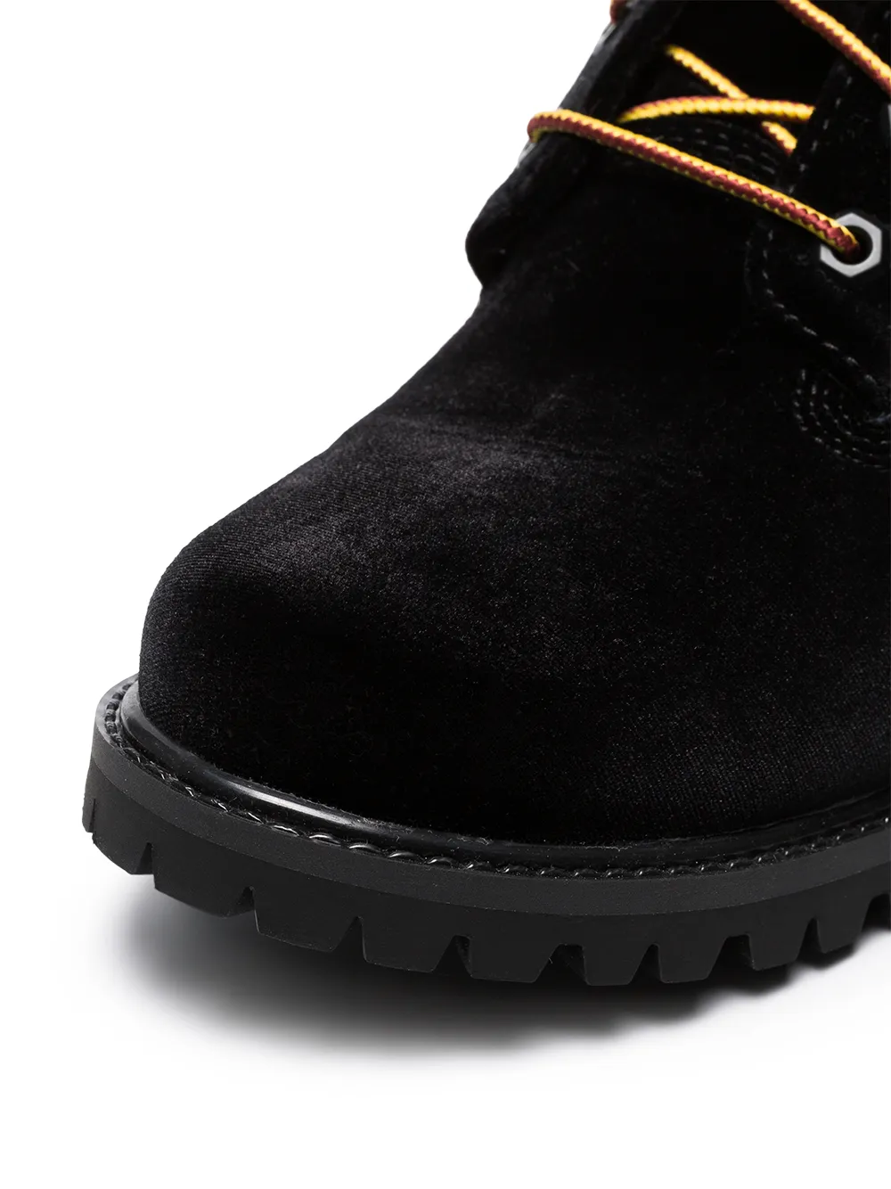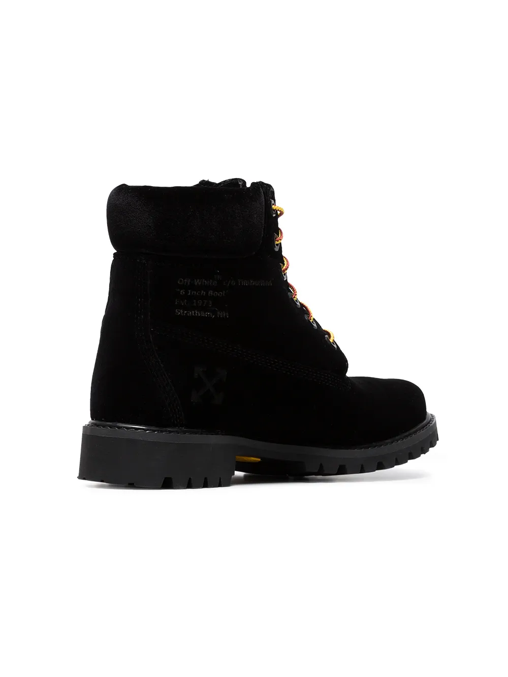 Eclectic American fashion label Off-White is renowned for its offbeat, stylish pieces. New to its latest collection are these black lace-up boots from the collaboration with Timberland, an ideal choice of footwear for a range of casual occasions. These Off-White x Timberland velvet boots from Off-White feature a round toe, a lace-up front fastening, a chunky low block heel and an ankle length.
