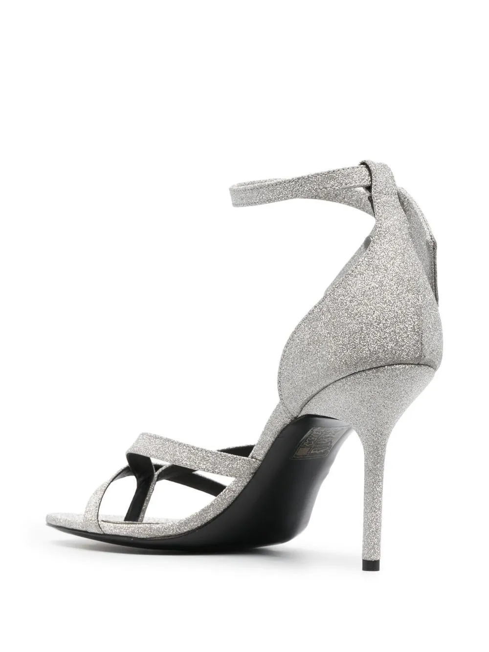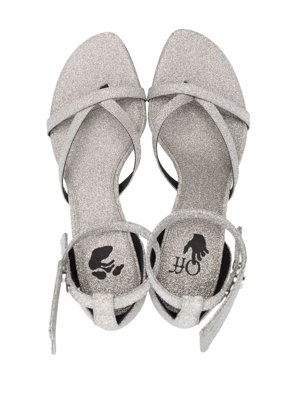zip-tie glittered leather sandals from OFF-WHITE featuring silver-tone, calf leather, glitter detailing, signature Zip Tie tag, open toe, branded insole and 90mm stiletto heel.