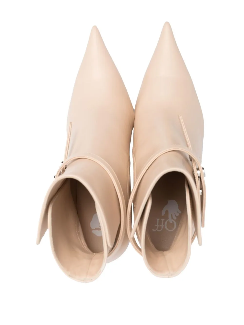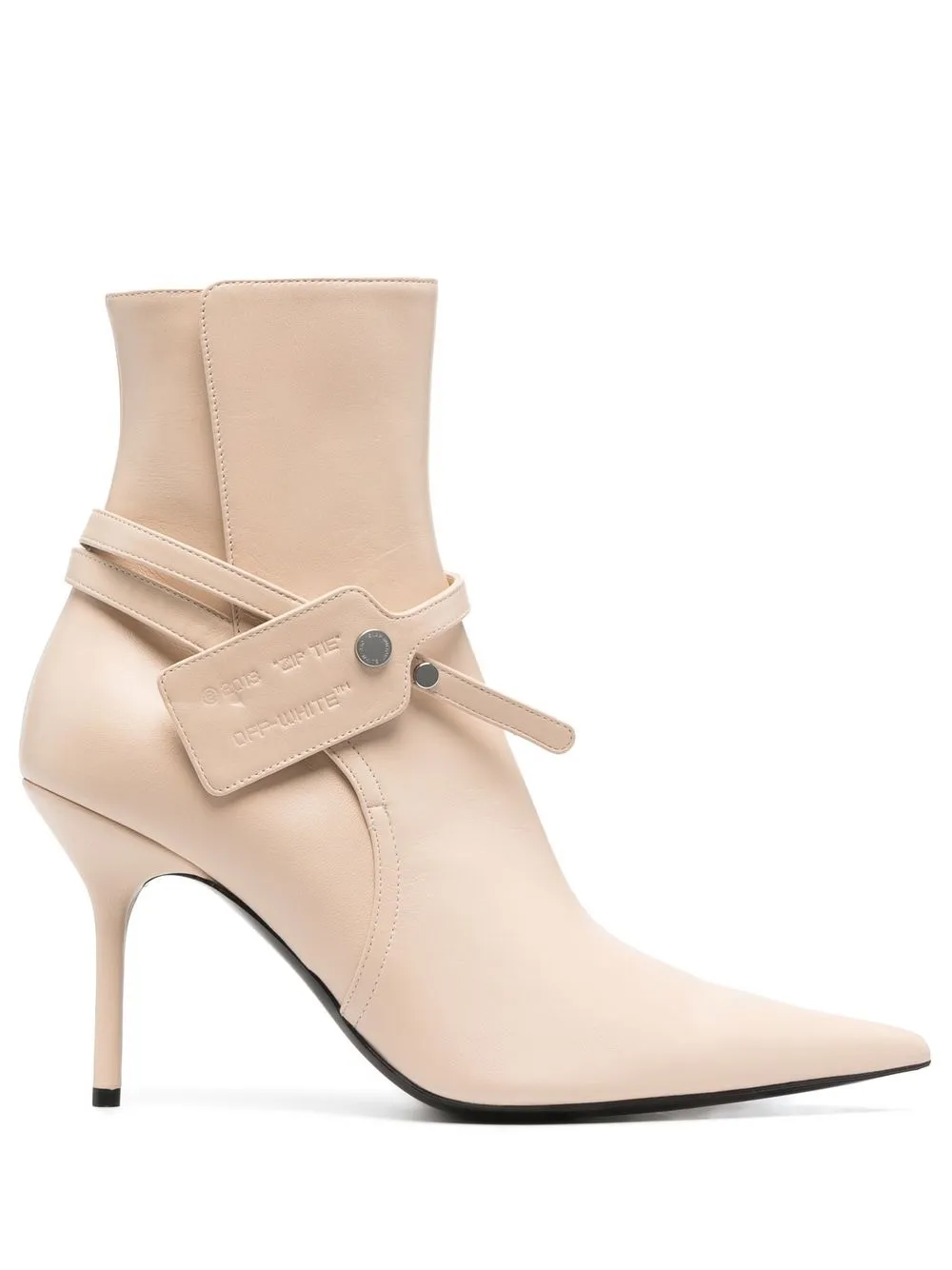 Zip Tie pointed leather boots from OFF-WHITE featuring almond beige, calf leather, signature Zip Tie tag, pointed toe, branded leather insole, ankle-length and high stiletto heel.